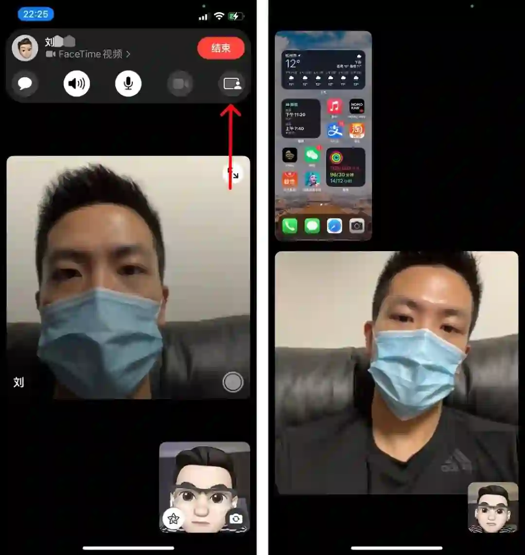 点击这枚图标,用户就能把自己当前的屏幕实时传输至对方的设备上。在 FaceTime 共享屏幕时,在对方的设备上,屏幕上会同时显示两个 FaceTime 头像以及共享的屏幕。点击共享的屏幕,可以全屏展示,更加直观清晰地观看。当然,被共享的用户无法进行操作,只能观看。