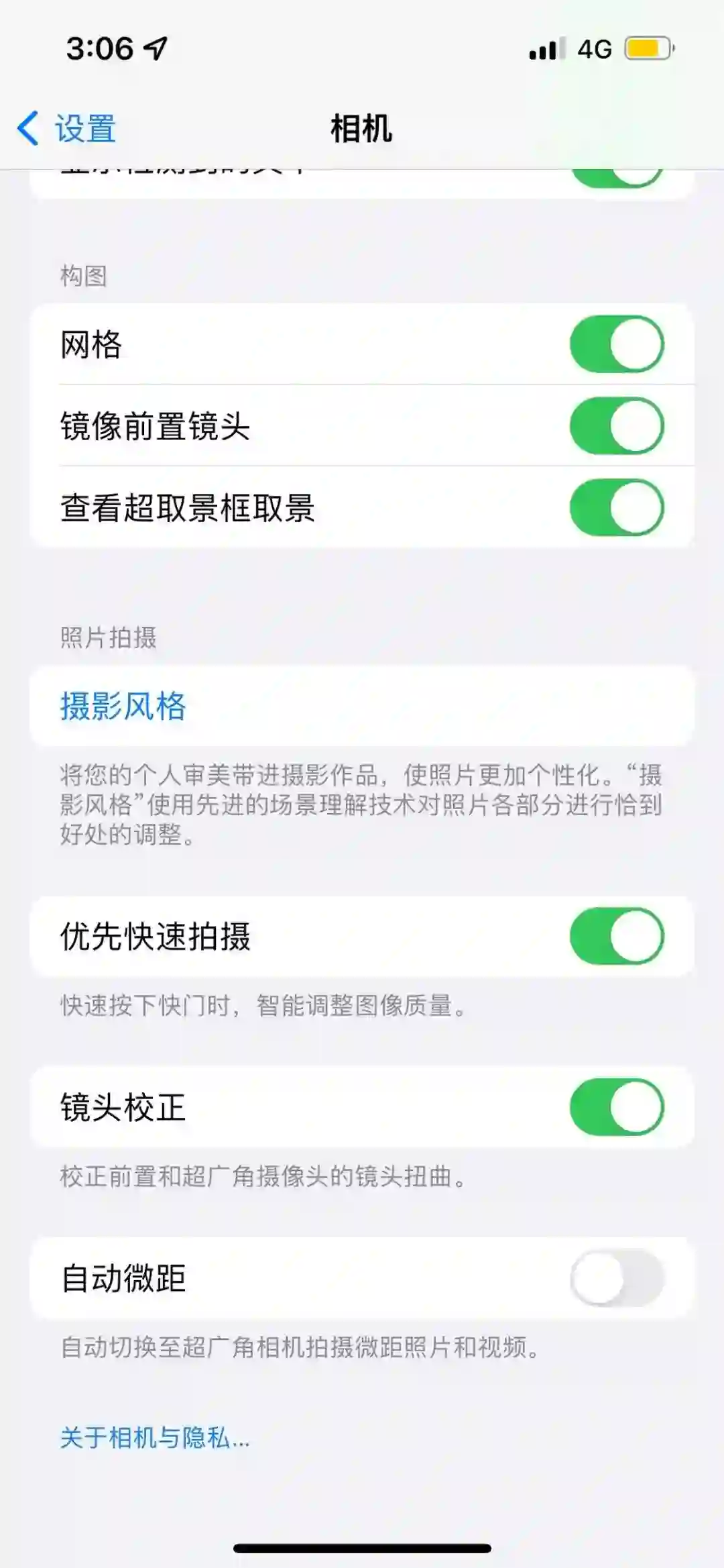 除了 Apple ProRes 格式的支持外,iOS 15.1 也为 iPhone 13 Pro 系列的自动微距加上了开关。现在用户可以根据自己的需要,在 设置 - 相机 - 自动微距 中打开或关闭拍摄时自动切换微距镜头。关闭「自动微距」后,在通过微距模式拍摄照片时,会锁定在超广角镜头进行拍摄。