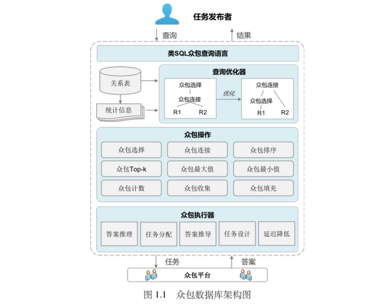 众包通过整合计算机和互联⽹⼤众来完成机器难以单独处理的任务,其主要 包含三部分,任务发布者、众包平台和众包⼯⼈。传统众包技术中,三者的交互流 程过于复杂,导致任务发布者⽆法很好地管理任务。因此,众包数据库应运⽽⽣, 其从系统层⾯出发整合三者之间复杂的交互流程,使得任务发布者可以通过描述 性语⾔轻松利⽤⼯⼈操作数据,降低了众包的使⽤门槛。本⽂主要的内容如下: