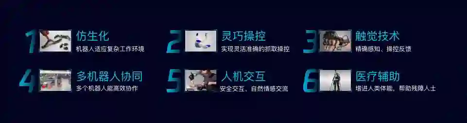 目前机器人本体研究存在六大趋势,分别为仿生化、灵巧操控、精准触觉、多机器人协同、人机交互和医疗辅助等。