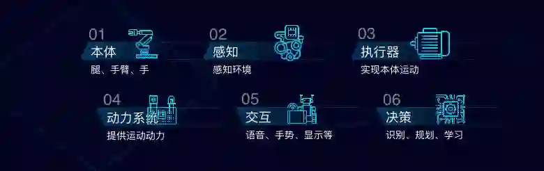 机器人由六大部分组成:本体、运动执行器、动力系统、感知、交互和决策系统。