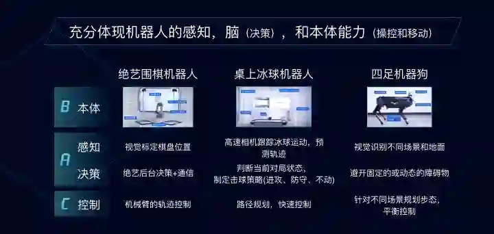 ABC代表了机器人的基础能力,包括:AI人工智能,代表机器人必须要能看、听、说、思考;Body本体:机器人本体至关重要,且不同的本体代表不同技术;最后是Control控制力。