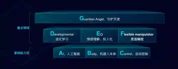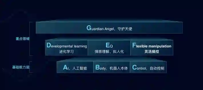 腾讯Robotics X的主要任务是攻克A到G的7大技术突破点:一是攻克“ABC”基础能力,即人工智能(AI)、机器人本体(Body)与自动控制(Control);二是探索“DEFG”机器智能,包括进化学习(Developmental Learning)、情感理解与拟人(EQ)、灵活操控(Flexible Manipulation)等能力,最终实现成为人类守护天使(Guardian Angel)的终极目标。