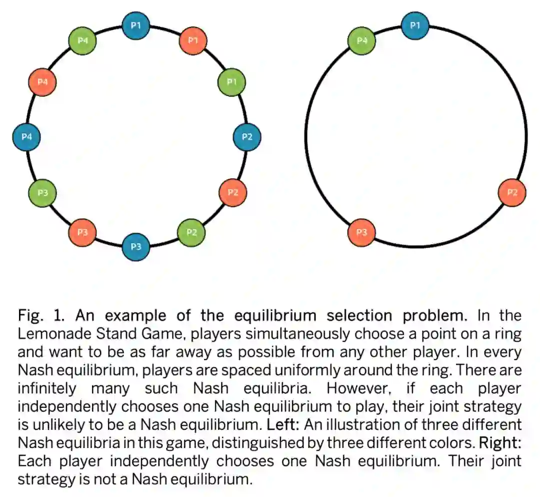 即使在多人博弈中每个玩家都得到了纳什均衡策略,这样执行下来的结果未必是纳什均衡的,Lemonade stand game 就是一个典型例子[4]。在 Lemonade stand game 中多个玩家同时在一个圆环上选择位置,目标是距离别人越远越好。这个博弈的纳什均衡是每个玩家在圆环上均匀分布,能达到这样效果的策略有无数多种,倘若每个玩家独立计算一种,则产生的联合策略不一定是纳什均衡,如图 1 所示。