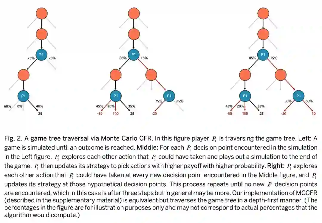 Pluribus 所使用的蓝图策略是 CFR(counterfactual regret minimization)中的一种。CFR 是一种迭自学习训练算法, AI 从完全随机开始,通过学习击败其早期版本逐渐改进。过去 6 年间几乎所有德扑 AI 都采用了 CFR 变形中的一种。在本文中,作者采用一种蒙特卡洛 CFR(Monte Carlo CFR) 方法对博弈树上的行动进行采样而不是在每次迭代时遍历博弈树。