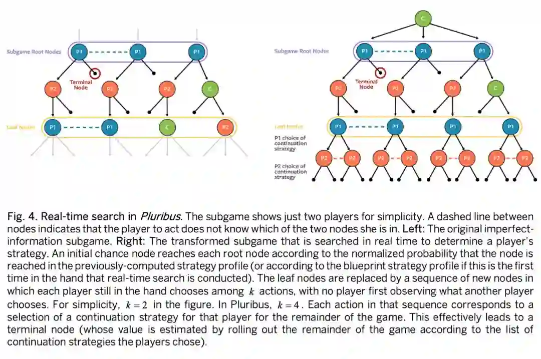 作者称 Pluribus 利用自学习制定的离线策略为“蓝图策略”,随着真实游戏的进行,Pluribus 通过在比赛中自己的实际情况实时搜索更好的策略来改进蓝图策略。