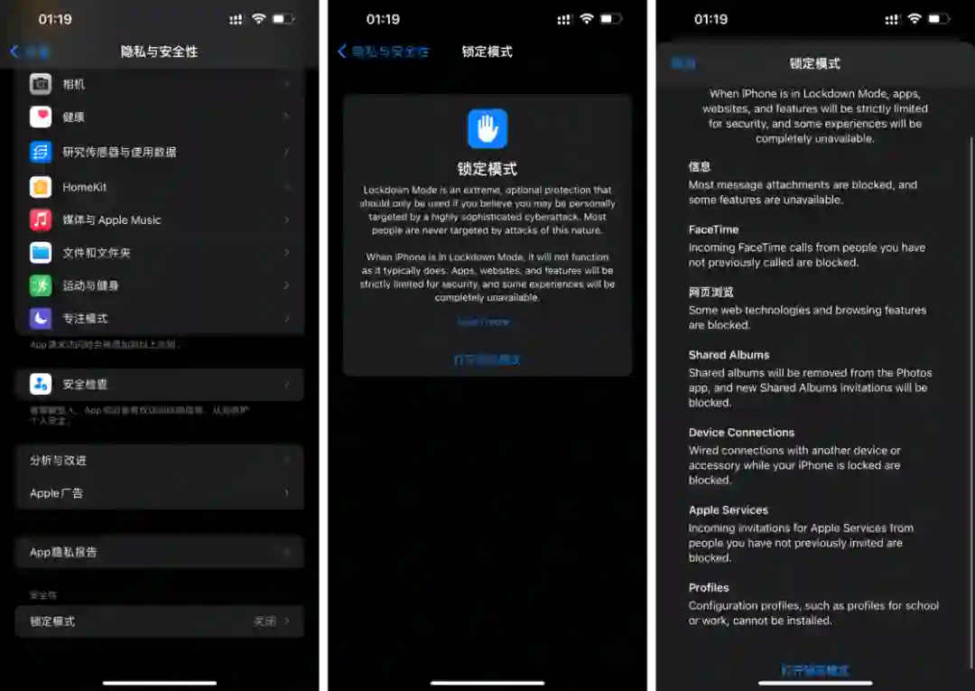 在 iOS 16 第三个开发者预览版中,Apple 推出了名为「锁定模式」的新功能,我们可以在「隐私与安全性」>「锁定模式」中打开它。