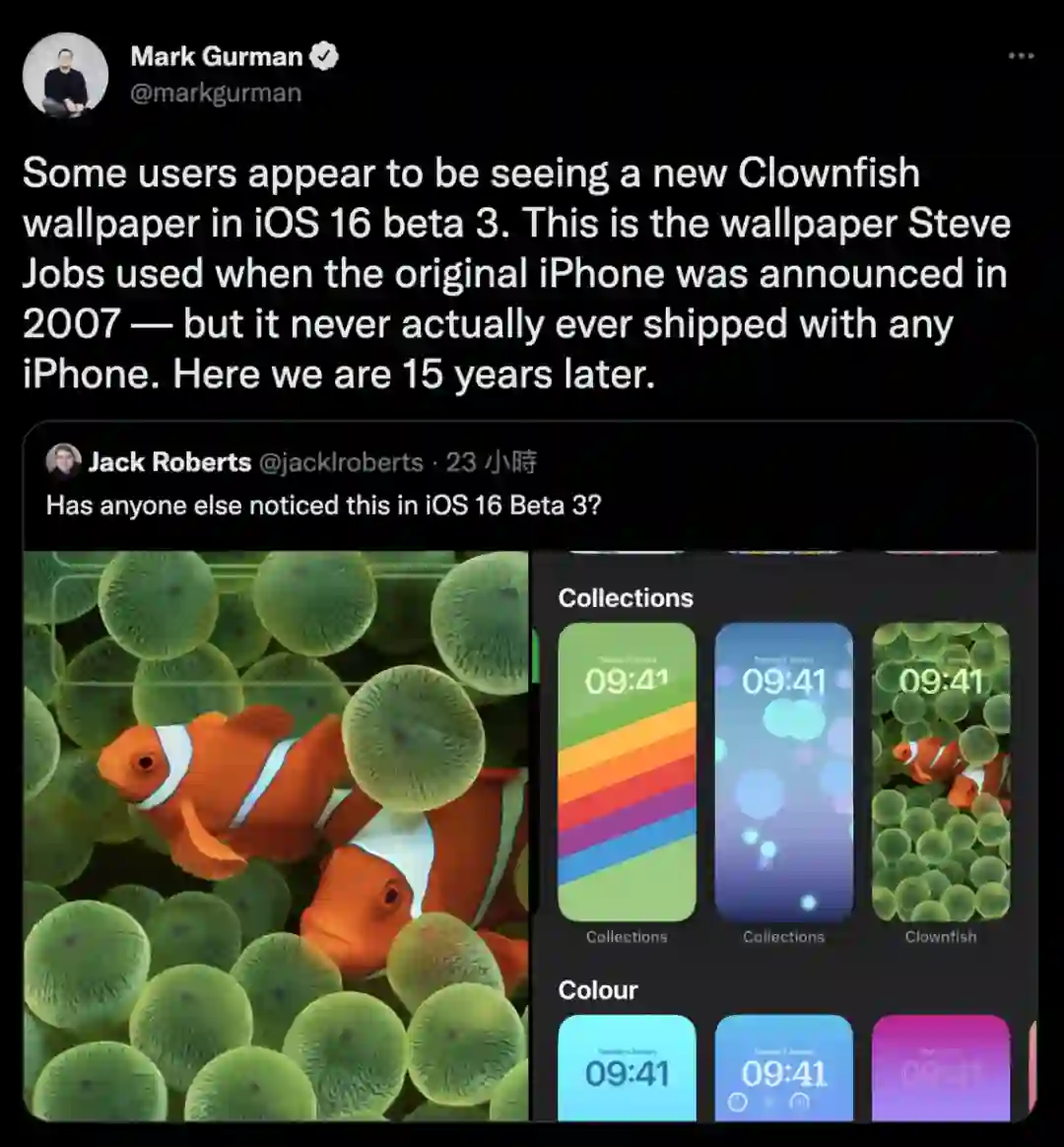 部分升级了第三个 Beta 版本的用户发现,在锁屏设置中出现了 iPhone 的经典壁纸选项「小丑鱼」壁纸。不过,我们升级之后没有在设置中看到这一选项。
