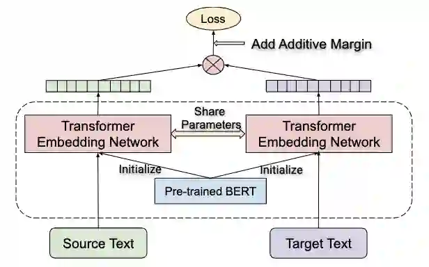 双编码器架构,源文本和目标文本分别使用共享参数转换器嵌入向量网络进行编码。应用翻译排名任务,迫使互相解释的文本具有相似的表达。转换器嵌入向量网络从在 MLM 和 TLM 任务上训练的 BERT 检查点初始化