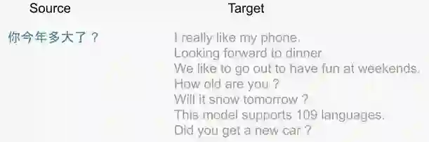 LaBSE 可用于从网络规模数据中挖掘并行文本 (bi-text)。例如,我们将 LaBSE 应用于大规模单语言语料库 CommonCrawl 处理 5.6 亿个中文和 3.3 亿个德语句子,提取并行文本。每个中文和德语句子对都使用 LaBSE 模型编码,然后使用编码后的嵌入向量从模型预处理和编码的 77 亿个英语句子库中查找潜在的翻译。采用近似最近邻搜索快速搜索高维句子嵌入向量。