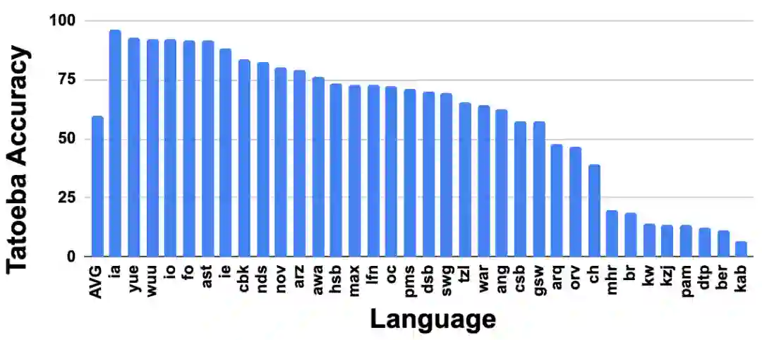 我们使用 Tatoeba 语料库评估模型,该数据集包含多达 112 种语言的 1000 个英语对齐句子对。对于数据集中 30 种以上的语言,该模型没有训练数据。该模型的任务是通过余弦距离进行计算,查找给定句子的最近邻翻译。