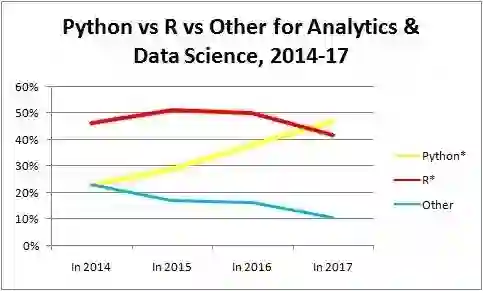 可以看到,R语言的使用率在逐年缓慢下降(从2015年的50%降到2017年的36%),而Python的使用率则从2014年的23%增长到2017年的47%。另外,其他语言的使用率也在逐年下降。