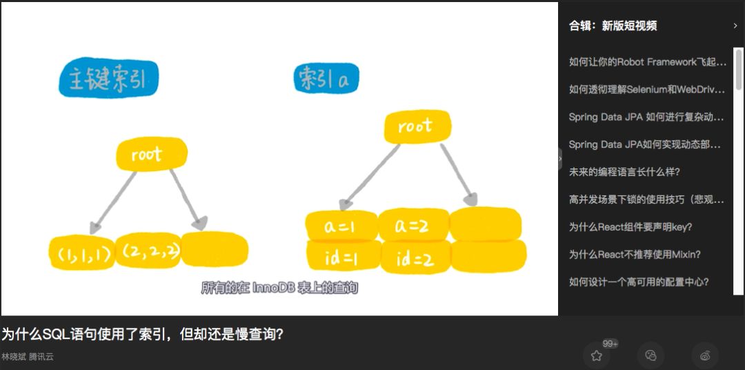 比如,数据库大佬、腾讯云数据库负责人丁奇老师,就用 10 分钟讲透“为什么 SQL 语句使用了索引,但却还是慢查询?”这个问题,他以查询大概 13 亿行数据的 MySQL 表 t_people 为例,用图例和语言为大家讲透了慢查询的原因,以及性能优化的方法,让人直呼“醍醐灌顶”。