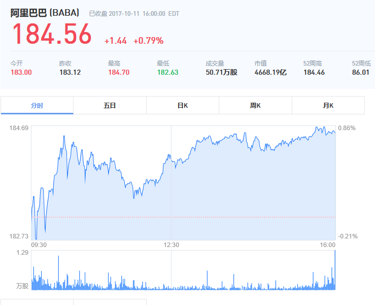 @华尔街见闻【阿里巴巴连续三天创纪录新高】中概股阿里巴巴收涨0.87%,以184.69美元创收盘纪录新高,2017年迄今涨幅已经扩大至110.33%,市值4730.195亿美元(亚马逊收盘市值为4779.776亿美元),百度收跌0.8%,报260.32美元,脱离盘中纪录高位263.44美元和周二所创收盘纪录高位262.41美元。此外,陌陌收涨2.28%,新浪收涨1.73%,微博收跌0.02%,网易收跌0.2%,京东收跌1.37%。
