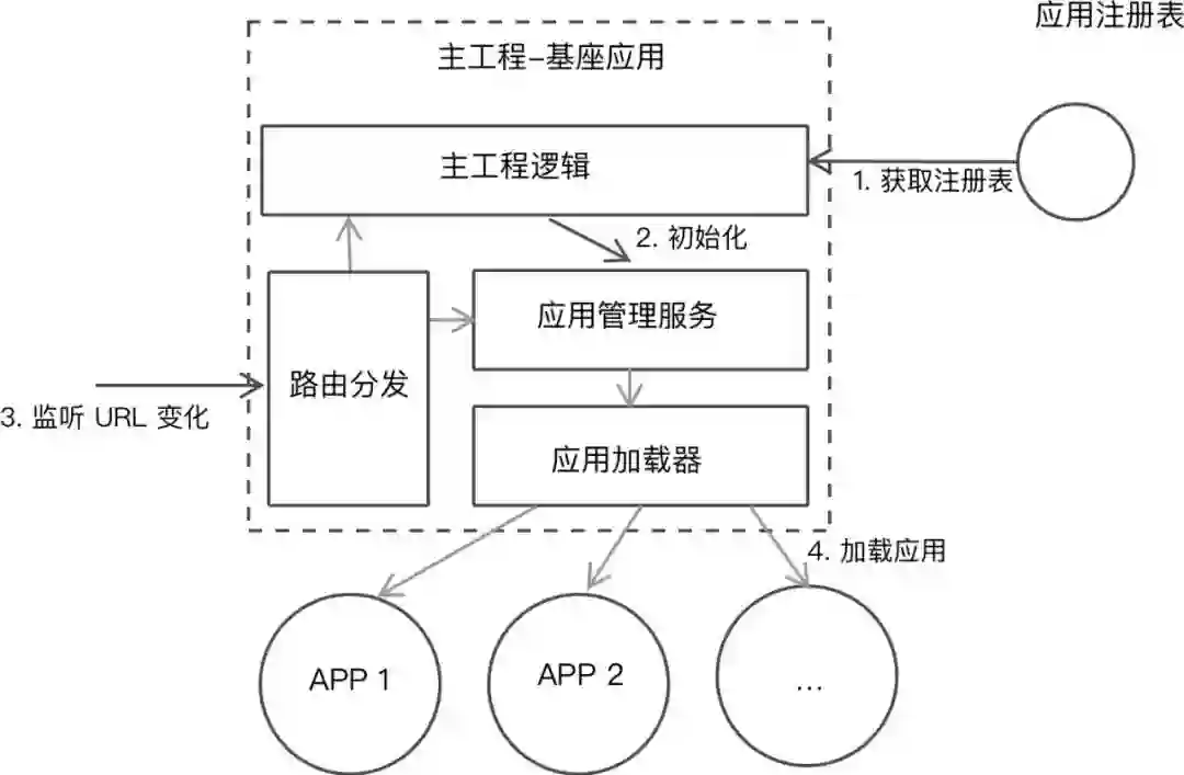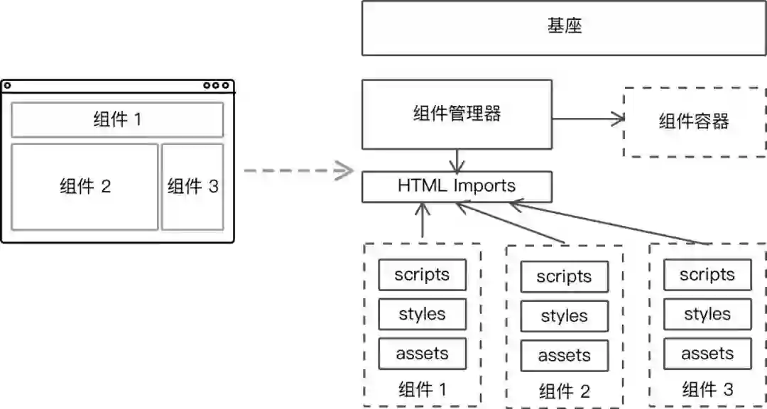 微应用化,即在开发时,应用都是以单一、微小应用的形式存在,而在运行时,则通过构建系统合并这些应用,组合成一个新的应用。其架构如下图所示: