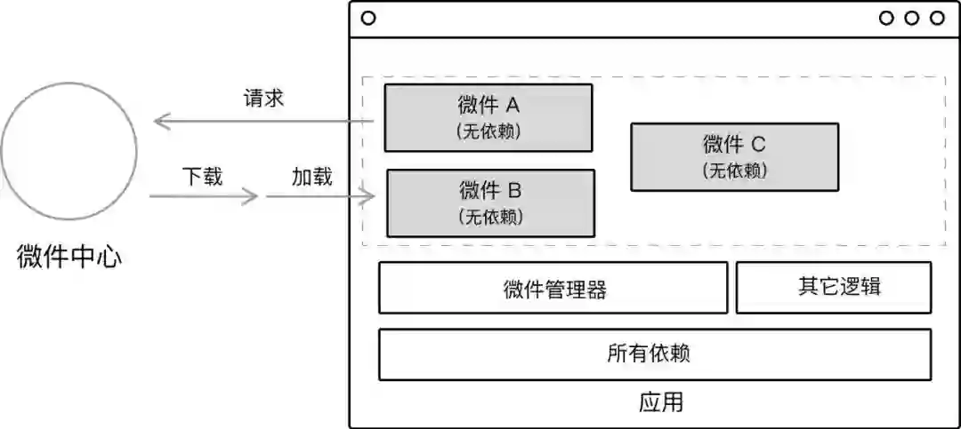 微件(widget),指的是一段可以直接嵌入在应用上运行的代码,它由开发人员预先编译好,在加载时不需要再做任何修改或者编译。而微前端下的微件化则指的是,每个业务团队编写自己的业务代码,并将编译好的代码部署(上传或者放置)到指定的服务器上,在运行时,我们只需要加载相应的业务模块即可。对应的,在更新代码的时候,我们只需要更新对应的模块即可。下图便是微件化的架构示意图: