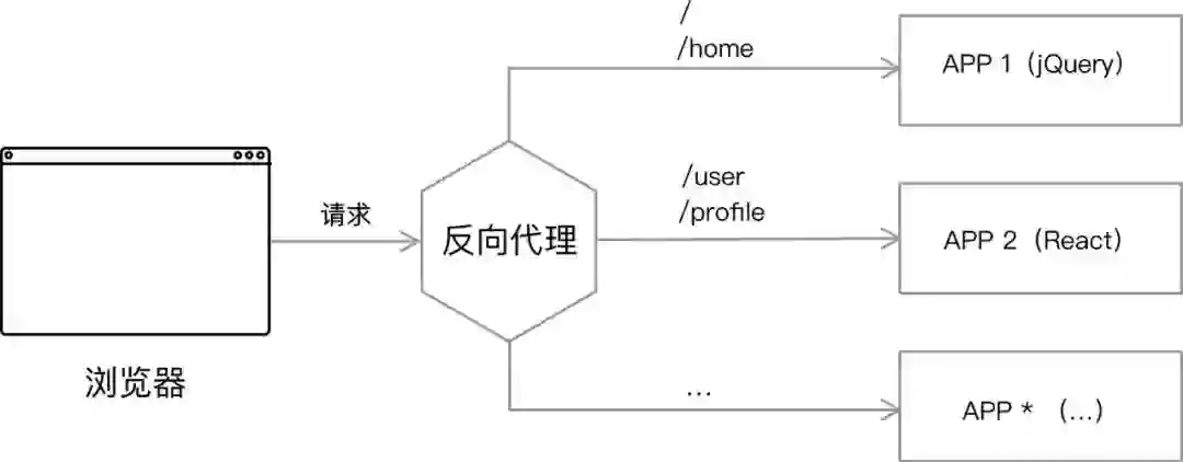 路由分发式微前端,即通过路由将不同的业务分发到不同的、独立前端应用上。其通常可以通过 HTTP 服务器的反向代理来实现,又或者是应用框架自带的路由来解决。如下图所示: