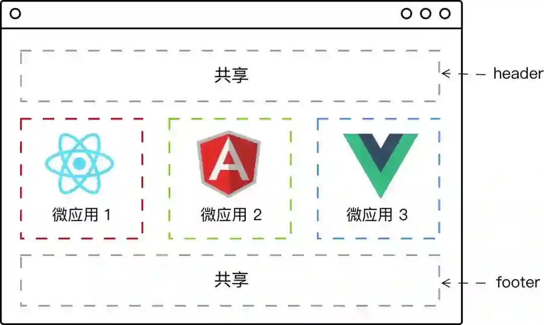 前端微服务化,是微服务架构在前端的实施,每个前端应用都是完全独立(技术栈、开发、部署、构建独立)、自主运行的,最后通过模块化的方式组合出完整的前端应用。其架构如下图所示: