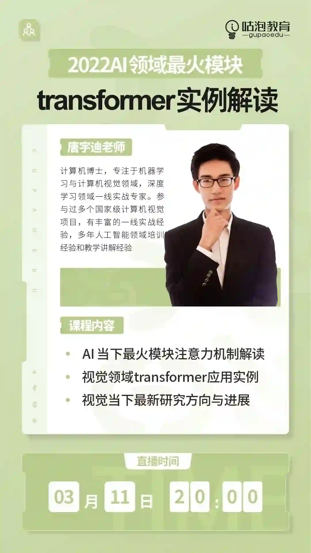 那么为了让大家更好地掌握图神经网络,咕泡教育现邀请到「人工智能实战专家 - 唐宇迪博士」,专为深度学习的同学开设了「transformer特训营 - <实例篇>」 ,既包括前沿的学术分享、又有来自头部大咖的实践分享。