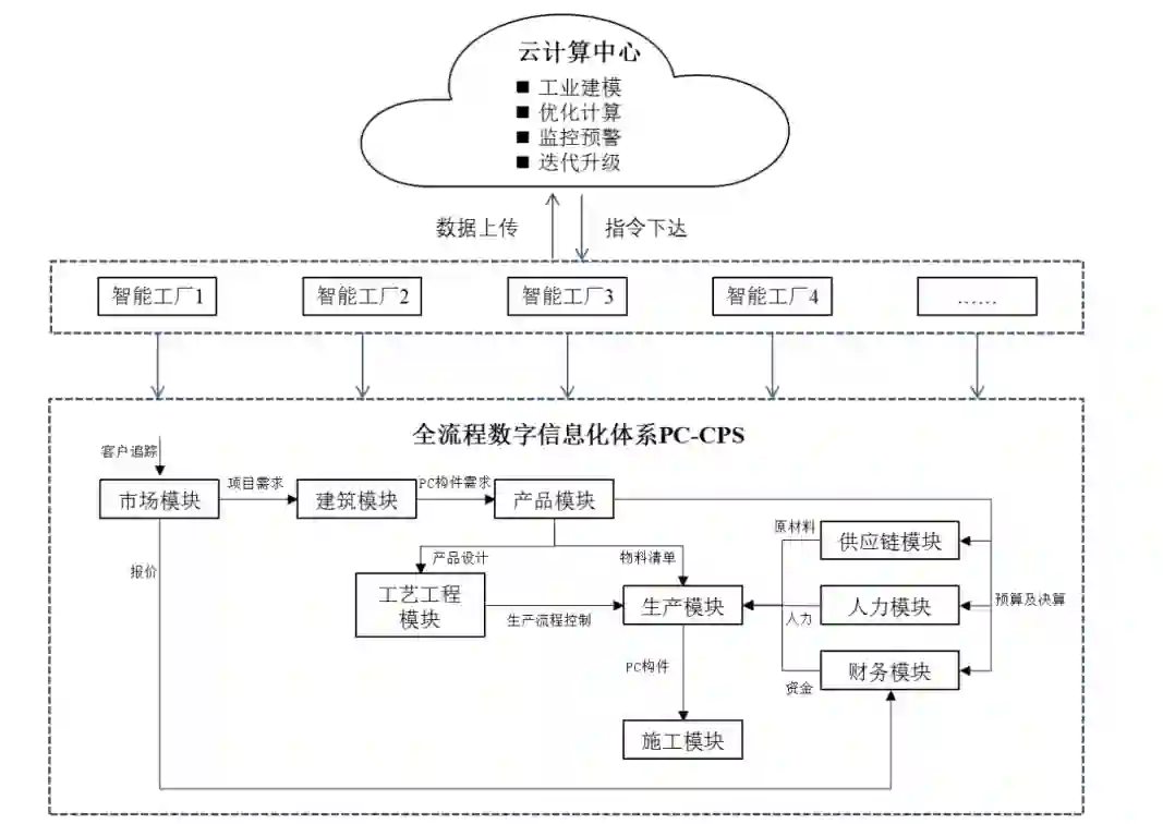最后在交付结算阶段,施工模块根据产品数据安排PC构件的运输物流以及生成安装指导,财务模块进行会计处理及结算;生产模块审查制造的生产率。