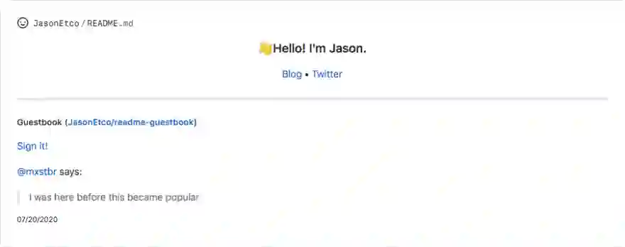我的好友 @JasonEtco[9] 一直在尽 Action 所能来推广 GitHub 和 Action,这次他用 Action 在 GitHub 简介做了一个留言簿。等着你们的点击、浏览、留言三连击,这样我们就功德圆满了哟~