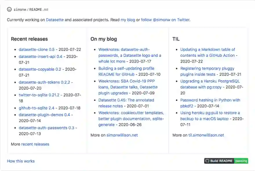@simonw[18] 的简介可以用 GitHub Action 进行自我更新,包括最近 release 信息、博文、学到的玩意。如果你对这个 README 的实现原理有兴趣,可以阅读下 Simon 发布的这篇博文[19] 。