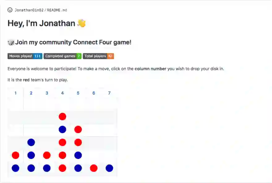 GitHub 简介出现游戏只是时间的问题,@jonathangin52[11] 是一个好榜样 💙 ❤️这款社区主导的 Connect4 可以做你想到任何事。