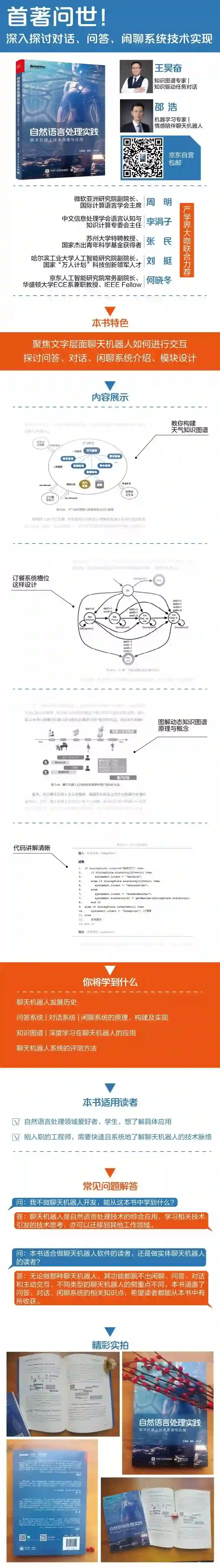 由王昊奋、邵浩等编著的《自然语言处理实践——聊天机器人技术原理及应用》已经在京东商城新鲜上市。本书将会深入探讨对话、问答、闲聊系统技术实现,感兴趣的朋友可以扫下方二维码进行了解。