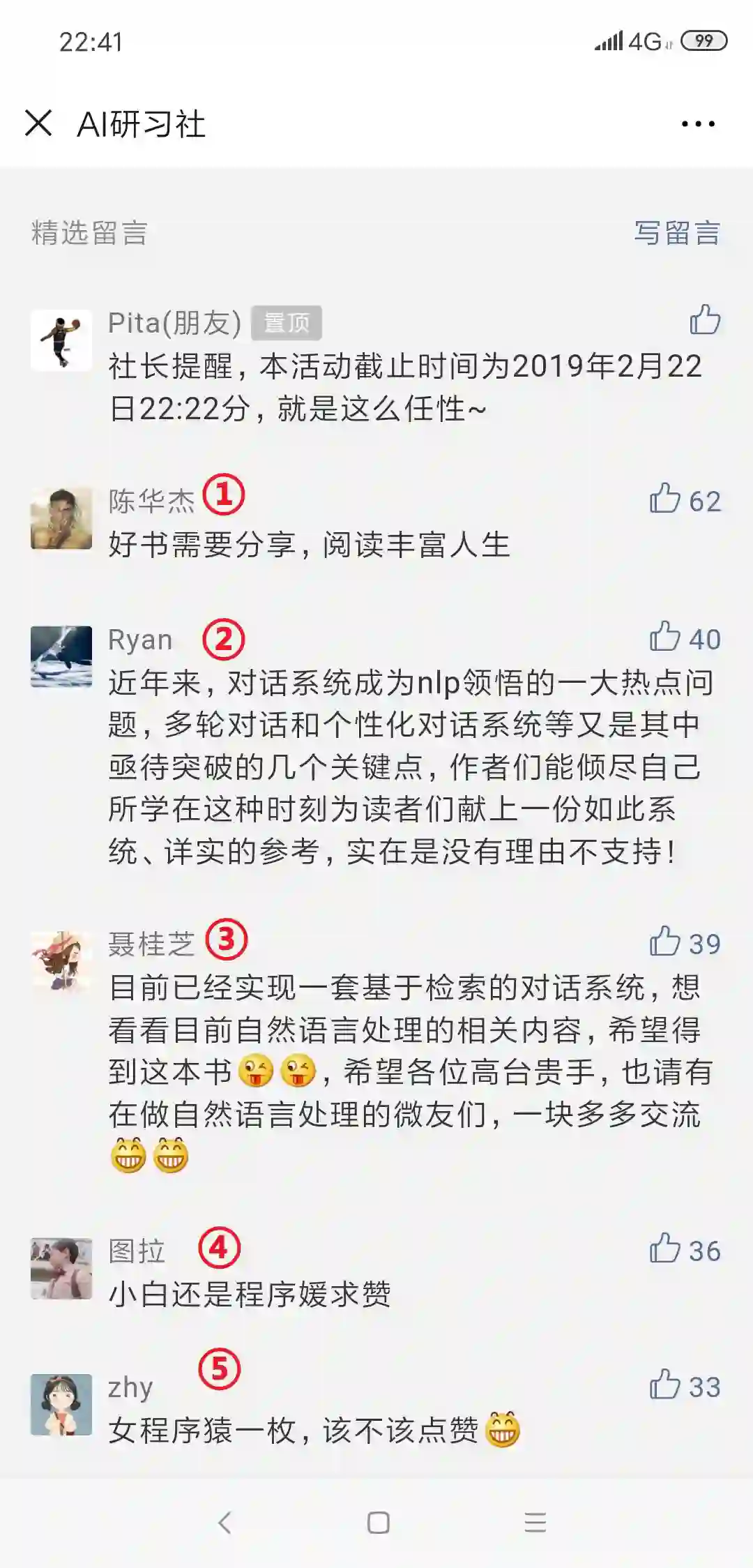 恭喜下方截图上的五位朋友获得由王昊奋、邵浩等编著的《自然语言处理实践——聊天机器人技术原理及应用》一本,请留意后续工作人员的联系。