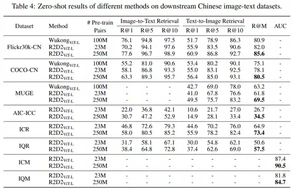 零样本任务。为了证明模型的泛化性能,研究者还进行了零样本迁移实验。从下表 4 中可以看出,与目前 SOTA 性能的 WukongViT-L 相比,R2D2ViT-L(23M)仅使用了不到 1/4 的数据,却在 Flickr30k-CN、COCO-CN 上都取得了更好的性能。当引入 2.5 亿级别的预训练数据时,R2D2 的精度获得进一步提升,相对 WukongViT-L,在 Flickr30k-CN 数据集上,R@M 提升到 85.6%(提升了 4.7%),在 COCO-CN 数据集上,R@M 提升到 80.5%(提升了 5.4%),在 MUGE 数据集上,R@M 提升到 69.5%(提升了 6.3%)。