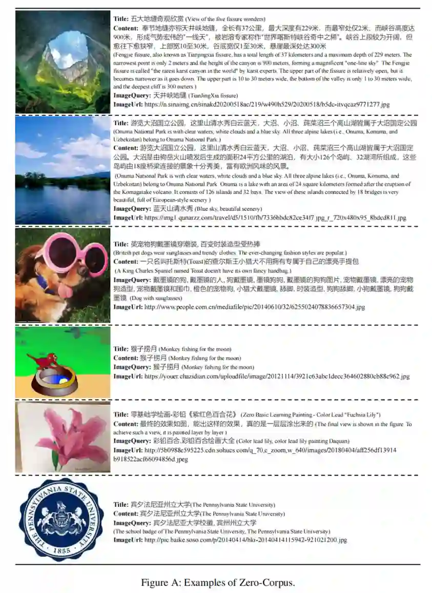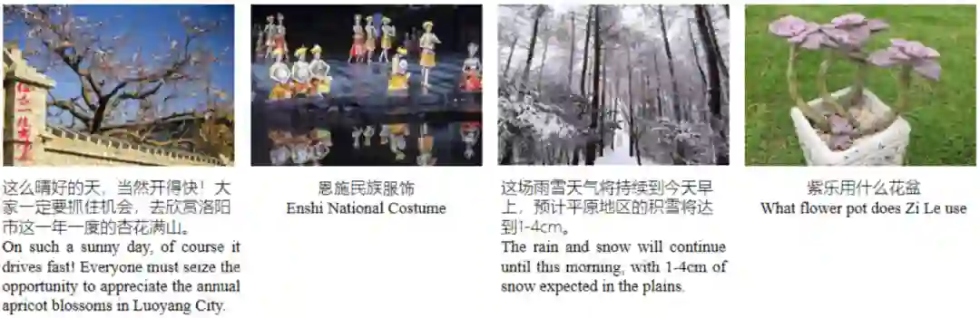 研究者还为每个图像提供了多样化的文本描述,包括标题(Title)、内容(Content)和图像查询词(ImageQuery)等。这些包含多个文本在内的信息,可以用于构建不同的跨模态任务,便于更全面地建模和研究图文之间的跨模态关系。下图显示了一些具体例子。