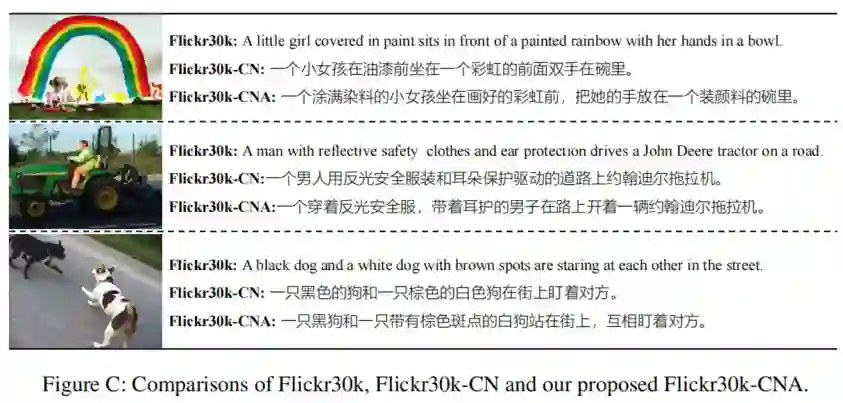 因此,研究者邀请了六位中英文语言学专业人士重新翻译了 Flickr30k 的所有数据,并对每个句子进行了双重检查,最终生成新数据集 Flickr30k-Chinese All(Flickr30k-CNA),用于进行图文跨模态任务评测。