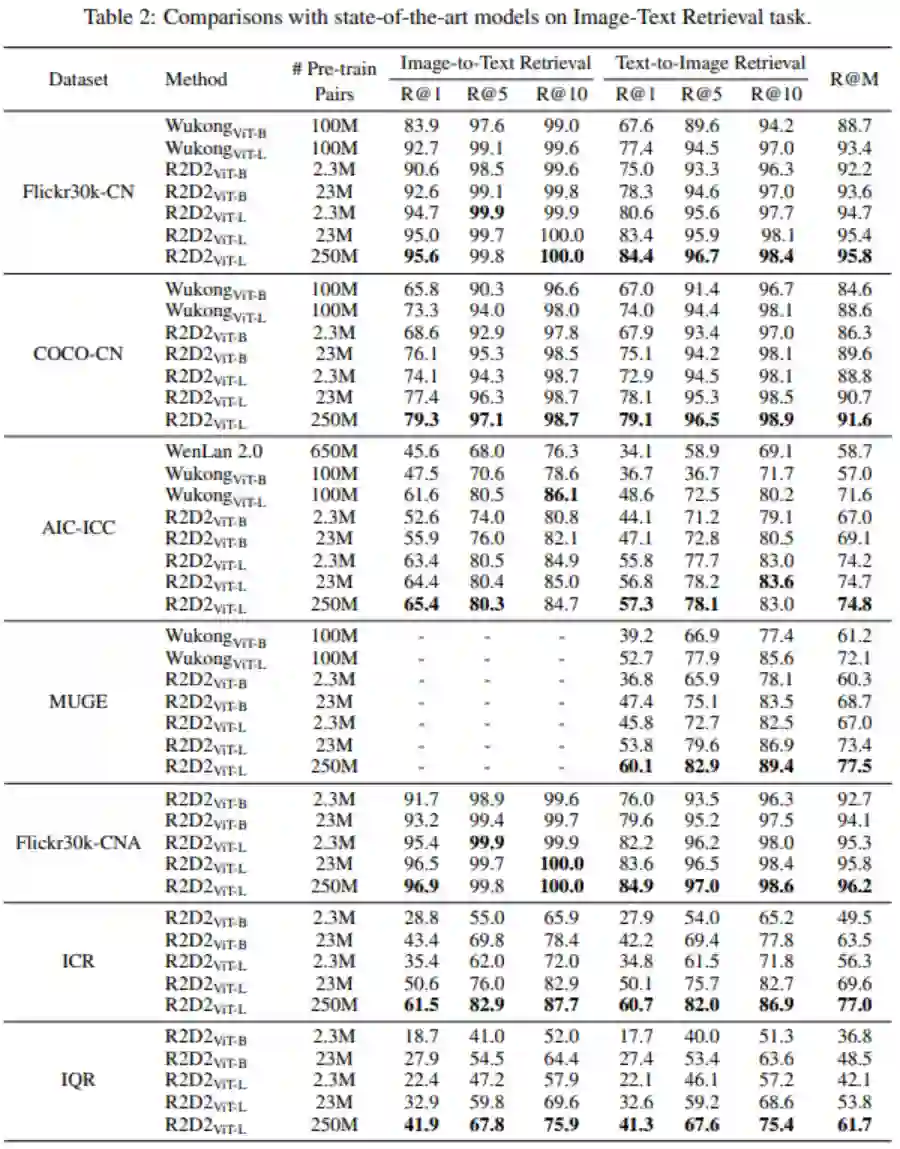从下表 2 中可以看出,研究者提出的模型在绝大多数任务中都超越了此前的 SOTA,即使仅使用 2.3M 样本(约为 Wukong 数据大小的 2.3%)进行训练时也是如此。对 23M 样本进行预训练时,结果更好。在模型层面,R2D2ViT-L 也在所有数据集中都优于 R2D2ViT-B,表明随着预训练模型变大,算法效果会变好。