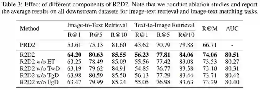 细粒度排序 (FGR) 的效果。首先,研究者使用全局对比预排序(GCPR)和双向蒸馏(TwD)训练模型,并定义为 PRD2。PRD2 的设置类似于 CLIP。从下表 3 的第一行和第二行可以看出,R2D2 在图文检索任务上的表现显著优于 PRD2,可以推测出该结果显著好于 CLIP,这说明了提出的全局对比预排序 + 细粒度排序框架的有效性。