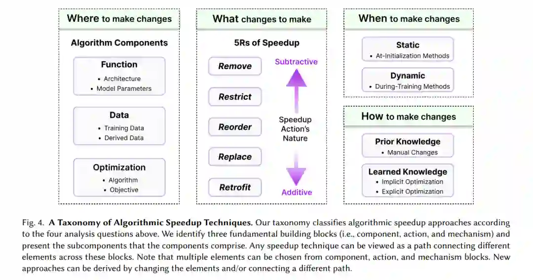 在过去的几年里,深度学习(DL)在广泛的应用领域取得了显著的进展,如蛋白质结构预测(AlphaFold [Jumper et al。2021])、文本到图像合成(DL - e [Ramesh et al。2021])、文本生成(GPT-3 [Brown等人。2020a])等。实现这些性能提升的关键策略是将DL模型扩展到非常大的规模,并对它们进行大量数据的训练。对于大多数应用程序,可训练参数的数量至少每18至24个月翻一番——语言模型以4至8个月的翻倍时间领先(Sevilla and Villalobos 2021)。大规模人工智能模型的著名例子包括:用于视觉应用的Swin Transformer-V2 [Liu等人2022a],用于语言建模的PaLM [Chowdhery等人2022],用于内容推荐的波斯[Lian等人2021],具有100万亿参数。尽管扩大DL模型正在实现前所未有的进步,但训练大型模型已经变得极其昂贵。例如,GPT-3训练成本估计为165万美元,使用谷歌v3 TPU[Lohn和Musser 2022],且transformer 模型的低效/幼稚开发将产生相当于5辆汽车终生碳足迹的二氧化碳(CO2) [Strubell等人,2019]。值得关注的是,DL仍然没有达到许多应用所要求的性能水平:例如,在现实世界中部署全自动驾驶汽车需要人类水平的性能,但还没有达到。不断增长的模型和数据规模以达到所需的性能将使当前的训练策略在金融、环境和其他方面不可持续。事实上,根据目前的趋势推断,2026年最大的人工智能模型的训练成本将超过美国的GDP总量(Lohn and Musser 2022)。此外,DL对计算的高度依赖引发了人们对财务资源有限的用户(如学者、学生和研究人员(特别是来自新兴经济体的人)的边缘化的担忧[Ahmed and Wahed 2020]。我们将在附录A中更详细地讨论这些关键问题。考虑到其计算负担的不可持续增长,DL的进步需要更多的计算效率训练方法。一个自然的方向是消除学习过程中的算法效率低下,以减少DL训练的时间、成本、能量和碳足迹。这种算法高效的深度学习方法可以通过多种方式改变训练过程,包括:改变数据或样本呈现给模型的顺序;调整模型的结构;改变优化算法。这些算法改进对于实现有效深度学习训练所需计算负担的估计下界至关重要,目前的做法导致的负担大大超过了该下界[Thompson等人,2020]。此外,这些算法增益与软件和硬件加速技术相结合[Hernandez和Brown 2020]。因此,我们相信算法高效的逻辑学习提供了一个巨大的机会来增加逻辑学习的收益并降低其成本。虽然最近涌现的算法效率论文支持了这一观点,但这些论文也表明,算法效率方法的研究和应用受到碎片化的阻碍。不同的指标被用来量化效率,这产生了不一致的加速方法的排名。评估是在狭窄或特征不佳的环境中执行的,这将导致不正确或过于宽泛的结论。在讨论算法效率方法时,缺乏反映它们的广度和关系的分类法,这使得人们很难理解如何遍历加速环境,将不同的方法结合起来并开发新的方法。因此,本文的核心贡献是组织算法效率文献(通过受[Von Rueden等人2019]启发的分类法和调研),以及对影响报告和实现加速的实际问题的技术描述(通过评估和实践指南)。我们的讨论始终强调这两个重点的关键交集:例如,算法效率方法是否会导致实际的加速确实取决于方法(通过我们的分类法可以理解)和计算平台(通过我们的从业者指南可以理解)之间的交互。我们的贡献总结如下: