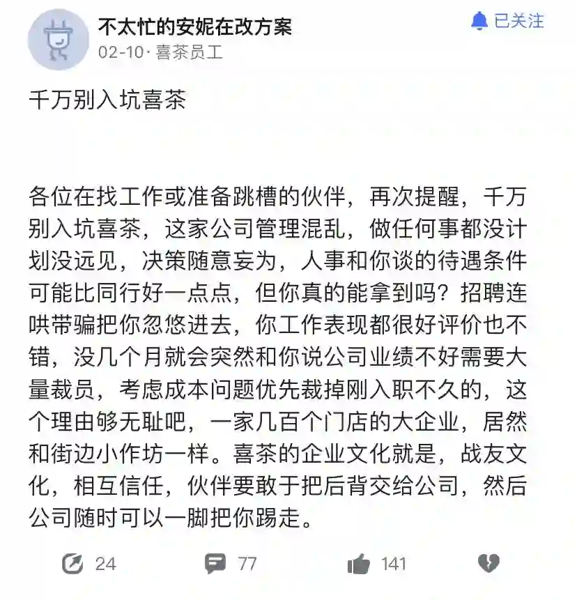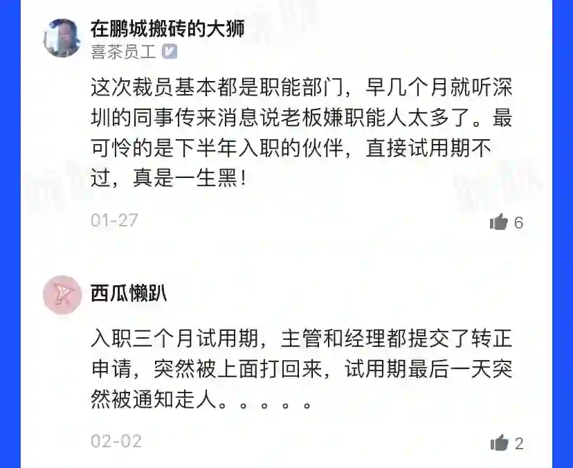 近期被曝出裁员的还有喜茶。多名在脉脉平台上认证的喜茶员工爆料称,喜茶去年年底裁员幅度达30%,其中信息安全部门全部裁掉,门店拓展部门被裁50%,并且全体员工没有年终奖。