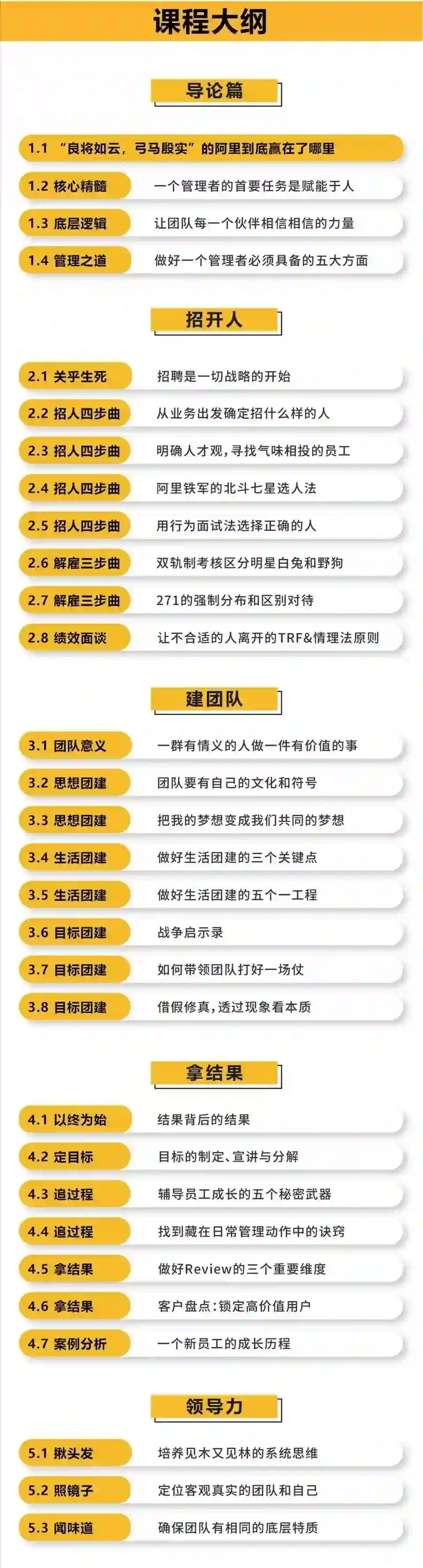 课程以“招开人、建团队、拿结果”为核心要点展开,并辅以案例,围绕创业公司常见的管理问题,以阿里先进的管理经验分析解读。