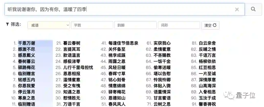 比如还是这句“听我说谢谢你,因为有你,温暖了四季”,用成语应该怎么说?