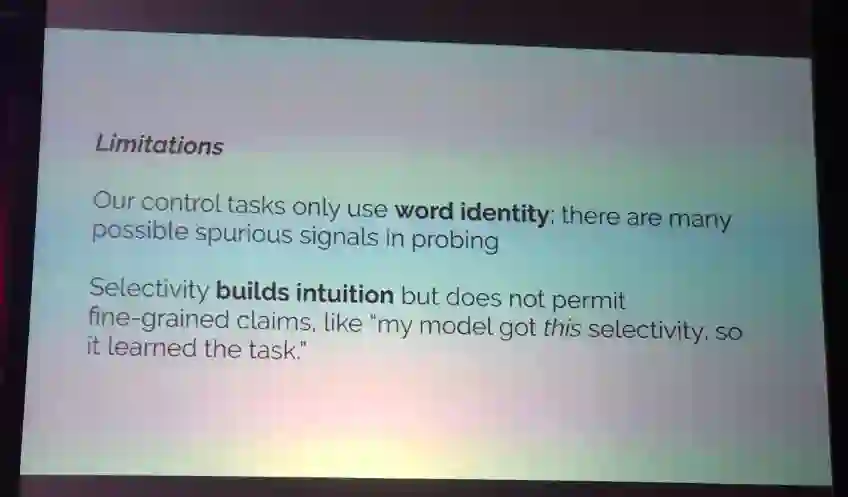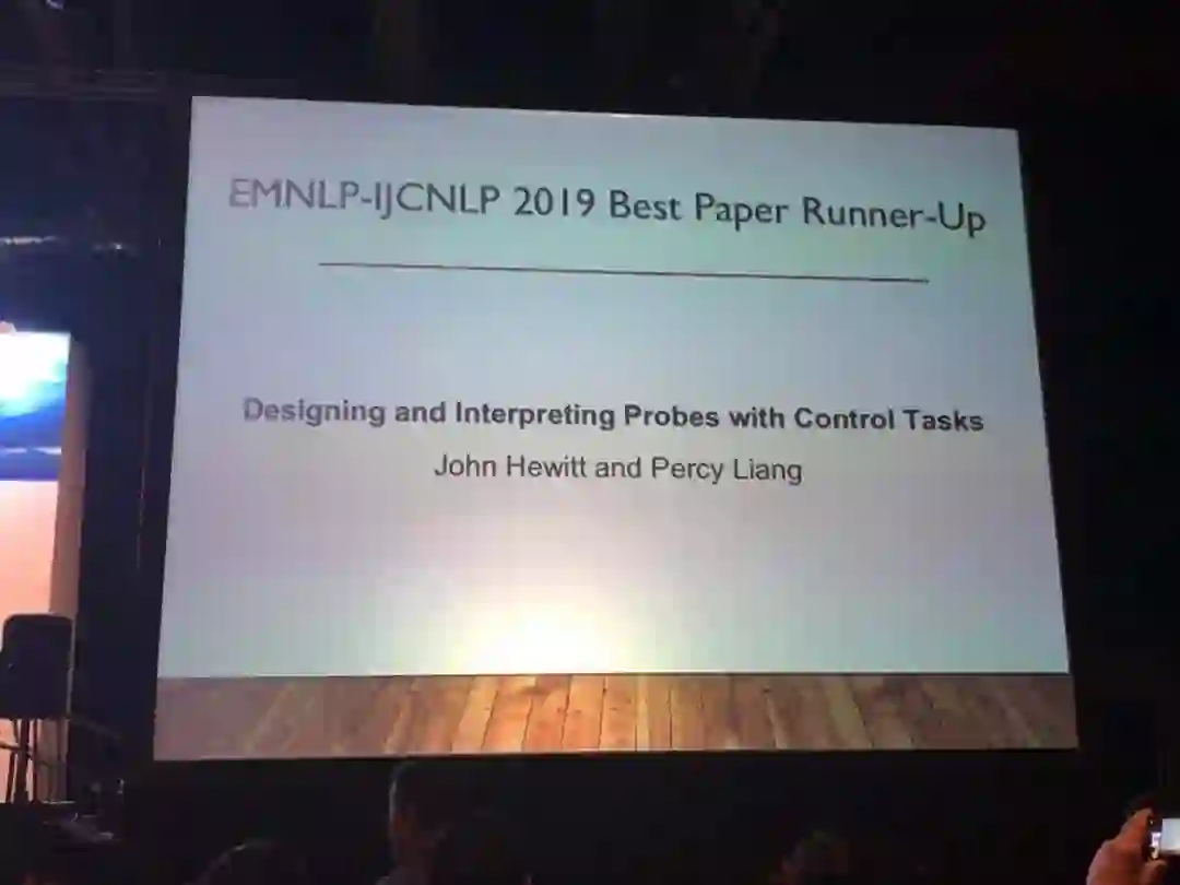 最佳论文奖第二名(Runner-Up)的第一作者来自斯坦福大学,其联合导师为 Chris Manning (计算语言学的大牛,李飞飞辞任后,Manning接任了斯坦福AI Lab主任)以及Percy Liang。这篇论文的颁奖词是“这是一篇影响力高、影响也深远广泛的论文,它介绍了如何设计、训练、解释探针,以便更充分地评价某种表征在给定的任务(比如POS标注或者依赖性解析)上到底学到了什么”。论文地址:https://www.aclweb.org/anthology/D19-1275.pdf论文摘要:研究者会设计训练一类监督模型来从表征(比如ELMo)预测某些属性(比如 POS),这类模型被称作探针,它们在许多语言学任务中都得到了很高的准确率。不过,到底是这些表征确实编码了语言学结构,还是只不过是这些探针学会了语言学任务而已呢?在这篇论文中,作者提出了一些控制任务,任务中考察的是把单词类型匹配到随机的输出,作为语言学任务的补充任务(无关任务)。设计这些任务的考虑就是,它们只能够被探针自己学会,也就成为了检验探针能力的方法。所以,一个好的探针(能切实反应表征的内涵的探针),应当是有选择性的,应当能在真正的语言学任务中取得高准确率,而在这个控制任务中取得低准确率。探针的选择性的体现,就是真语言学任务中的准确率和探针记忆单词类型的能力是一致的。作者设计了基于英文POS标注和依赖性边缘检测的控制任务,通过实验表明目前流行的用于ELMo表征的探针并不具有选择性。作者还发现,一般被用来控制探针复杂度的dropout方法,其实对于提升多层感知机(MLP)结构模型的选择性并没有帮助,但其它类型的正则化方法是有效果的。最后,作者还发现,虽然针对ELMo的网络第一层的探针在POS标签任务中能取得比第二层的探针稍好的表现,但第二层的探针的选择性要强很多;这也带来了一个新问题:到底网络的哪一层能更好地表征POS。作者在报告中也之处了他们控制任务的局限性: