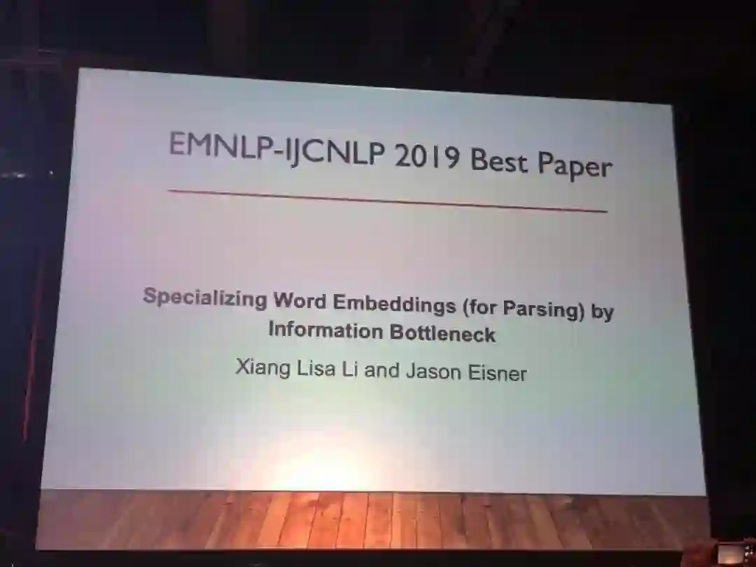 EMNLP-IJCNLP最佳论文奖只针对长论文颁发。本届最佳论文奖的第一作者为来自约翰霍普金斯大学的Xiang Lisa Li,而其导师则为NLP界公认的大神Jason Eisner,后者对NLP结构学习领域贡献极大。这篇论文获奖,原因则是:“在预训练词嵌入上使用变差信息瓶颈(Variational Information Bottleneck)的新颖应用。很棒的理论证明,不错的结果,很棒的语言学分析,很可能对许多任务都有帮助。”论文地址:https://arxiv.org/abs/1910.00163v1论文摘要:ELMo和BERT之类的预训练词嵌入包含了丰富的句法和语义信息,这让它们能在各种不同的任务上发挥出当前最好的表现。这篇论文中作者提出了一个非常快速的变差信息瓶颈(Variational Information Bottleneck,VIB)方法,它可以非线性地压缩这些嵌入,只保留对辨别性解析器有帮助的信息。作者可以把每个词嵌入压缩成一个个离散的标签,或者是连续的向量。对于离散标签版本,这些自动压缩的标签可以形成一种替代性的标签集合。作者通过实验表明,传统的POS标签标注中捕捉到的信息,大部分都可以被这些标签捕捉到,而且这些标签序列还可以在相同的标签粒度下得到更准确的解析。对于连续向量版本,实验表明用他们的方法适度压缩词嵌入之后可以得到更准确的解析器,他们测试的9种语言中有8种都得到了这样的结果;以往的简单的降维操作是达不到这样的效果的。
