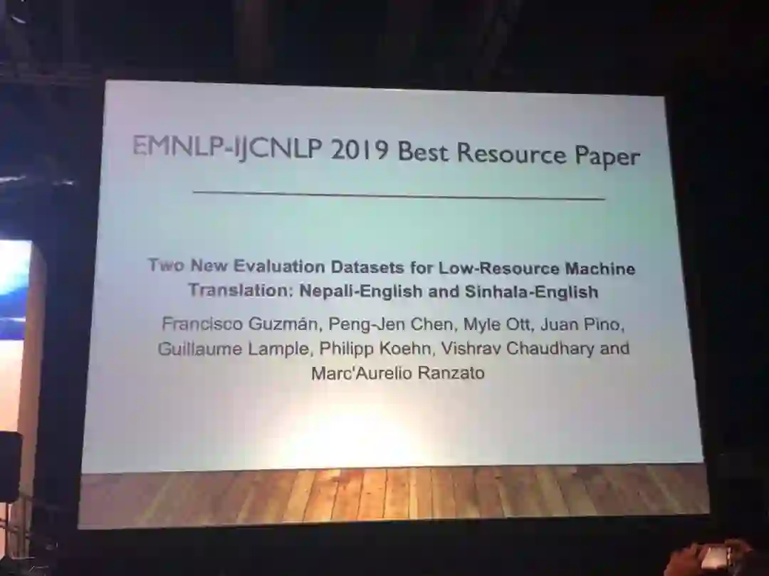 最佳资源奖的论文是由Facebook、法国索邦大学和约翰斯·霍普金斯大学共同完成。这项工作的贡献在于其提供的机器翻译数据集对低资源语言有很重要的意义,而详细且清晰的质量控制方法也值得其他类似的语料库收集工作借鉴。论文地址:https://arxiv.org/pdf/1902.01382.pdf数据集地址:https://github.com/facebookresearch/flores注:该论文在arXiv 上的名称为《The FLoRes Evaluation Datasets for Low-Resource Machine Translation: Nepali-English and Sinhala-English》论文摘要:世界上绝大多数语言都是低资源的,它们几乎没有(或只有少量)的并行数据。不幸的是,当前的机器翻译(MT)系统在低资源情况下还不能很好地工作。当然除了可用于监督学习的资源太少外,这些语言还面临一个问题,即由于缺乏可自由公开使用的基准,因此很难评估在低资源语言上进行训练的方法的优劣。在这项工作中,作者从Wikipedia网页中提取句子,并在低资源预料对(尼泊尔-英语和僧伽罗-英语)中引进了新的评估数据集。这些语言具有完全不同的形态和语法,对于这些语言,几乎没有可用的域外(out-of-domain)并行数据,但却有大量的单语数据可以使用。研究人员在文章中描述了收集和交叉检验翻译质量的完整过程,并使用几种学习方式(完全监督、弱监督、半监督、无监督)来报告基准性能。其实验结果相当有意思,当前最先进的方法在这个基准上的表现反而相当差。这也对研究低资源机器翻译的社区提出了新的挑战。