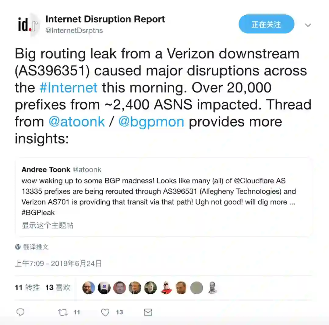 Verizon在错误接受了美国宾夕法尼亚州一家小型ISP(互联网服务提供商)的网络错误配置后,今天早上害得互联网的众多系统如同掉入黑洞,导致Cloudflare、Facebook、AWS及其他公司纷纷遭遇故障。