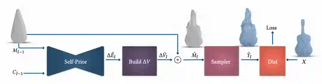 具体而言,Point2Mesh 通过优化卷积神经网络权重,不断迭代来使初始网格变形以收缩包覆给定的输入点云 X(如图 8 所示例子)来重构一张水密网格(watertight mesh)。正常的形状具有跨尺度的强自相关性,并且经常重复出现细粒度(fine-grained)的细节,然而噪声是随机且不相关的。这使得对重复出现的细粒度细节进行重构,同时消除噪声成为可能。