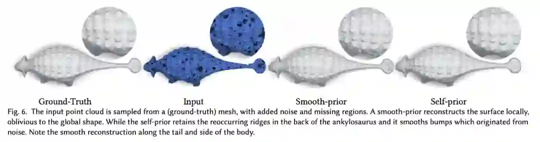 self-prior 的核心是卷积神经网络的权重共享结构,该结构本身能够对重复出现与相互关联的结构进行建模,因此对于那些噪声和异常值这类不是重复出现的几何形状不是很敏感。
