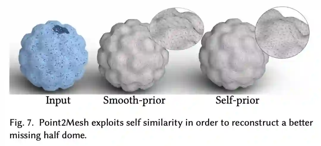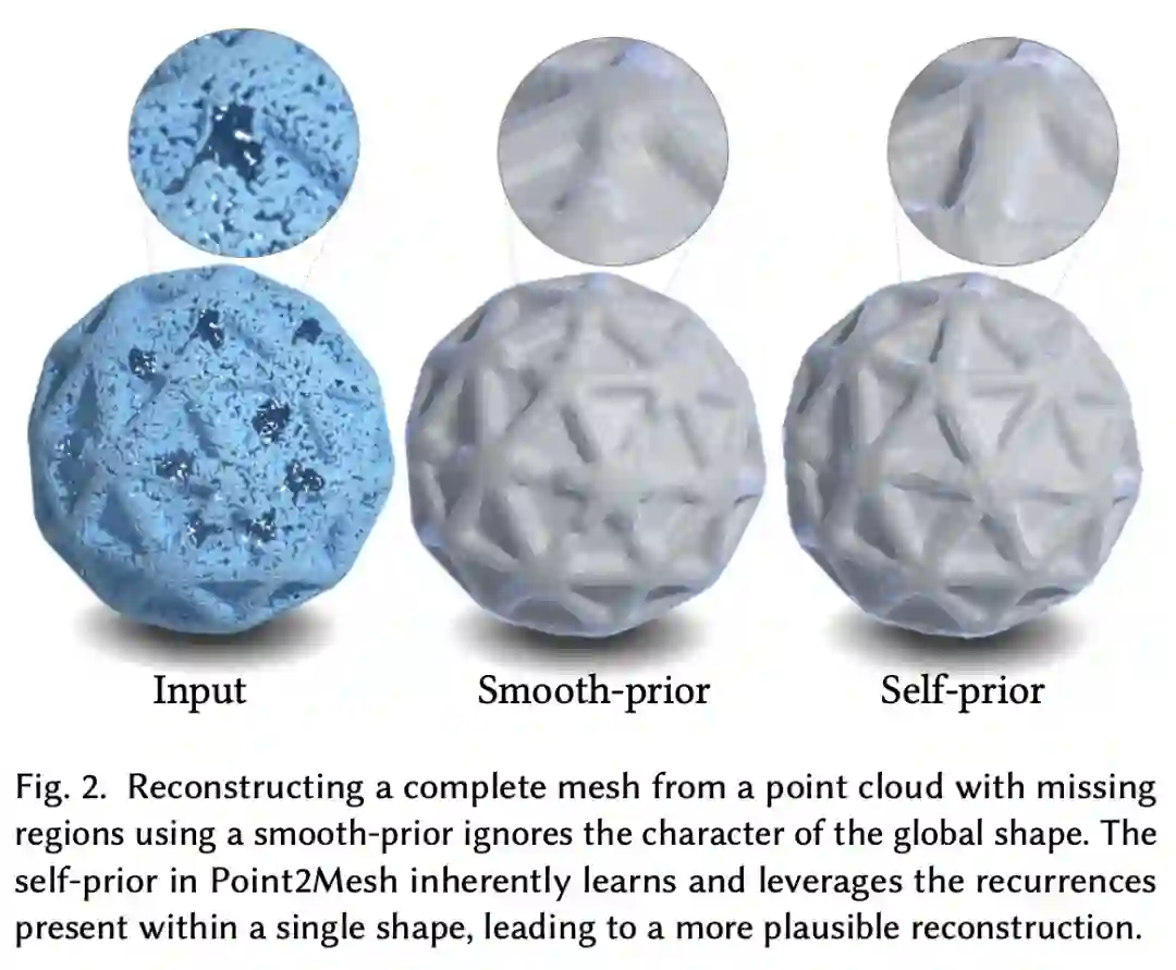 图 2:使用平滑 prior 从有缺失区域的点云中重构完整的网格,该方法会忽略整体形状特征。