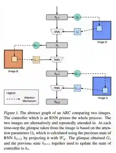 本文由北卡罗来纳大学和印度科学研究院共同完成。Attentive Recurrent Comparator (ARC) 可学习一个近似的动态表示空间用于极小样本学习。在极小样本学习公开数据集合Omniglot上,错误率降低为1.5%,可以说是在这个人物的公开测评库上,AI超过了人类的识别水平。这个工作主要模拟人类比较两个图像相似度的行为,用一个RNN网络协调整个过程,采用相应注意力模型让两幅图像交替比对。在每一个Time Step,结合图像局部区域信息和RNN的前一个时刻状态,产生当前时刻状态。RNN的最终状态可推导出两副图像的相关性表示(Relative Representation)。