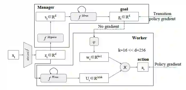 本文由Google DeepMind发表。策略网络被划分为两个模块:管理者和工作者。管理者模块在低时间分辨率工作,产生中长期子目标;工作者模块在高时间分辨率工作,从管理者模块拿到子目标,并上原始的环境观测一起输出当前时刻的决策动作。本文这种精巧设计的网络结构能自动「发现」子目标,并自动学出相应的「子策略」,而之前的工作都采用了手调子目标的方式,在灵活性和通用性不如本文所提出的算法。