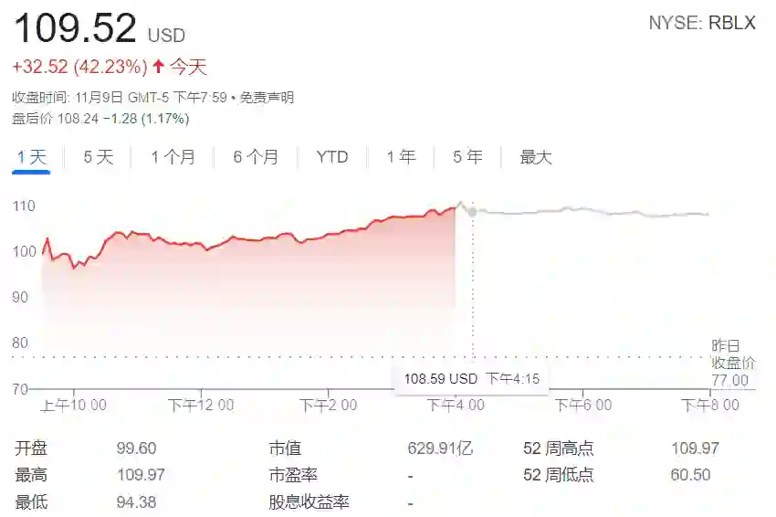 受财报消息影响,Roblox 股价飙升42.23%,收于每股 109.52 美元。