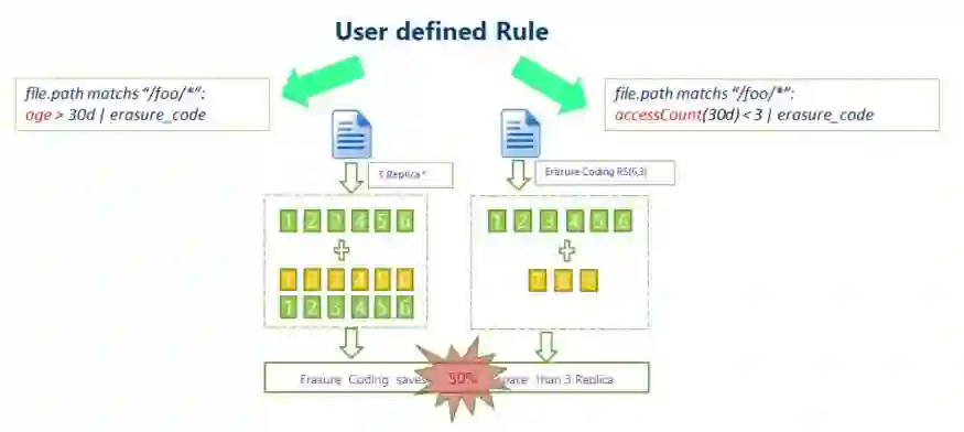 针对冷数据的场景,SSM也可以采用纠删码的优化,通过定义相应规则,对于访问次数很少的冷数据,对其执行erasure code操作,降低数据副本冗余。