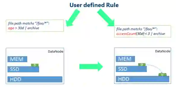 最典型的场景就是针对冷数据,如上图所示,定义相关规则,将较长时间为没有访问的数据采用更低成本的存储。例如原先的数据块,从SSD存储退化到HDD存储。